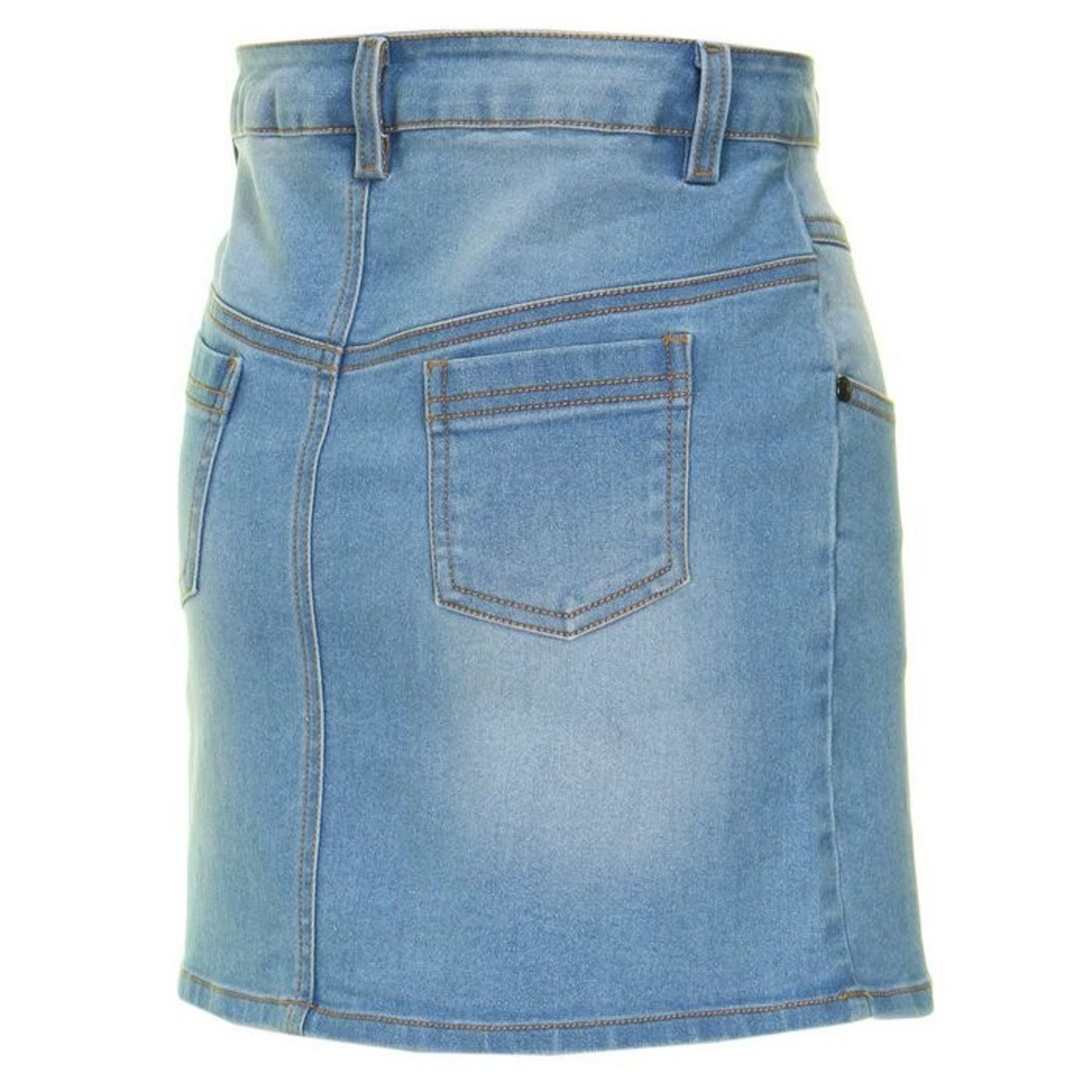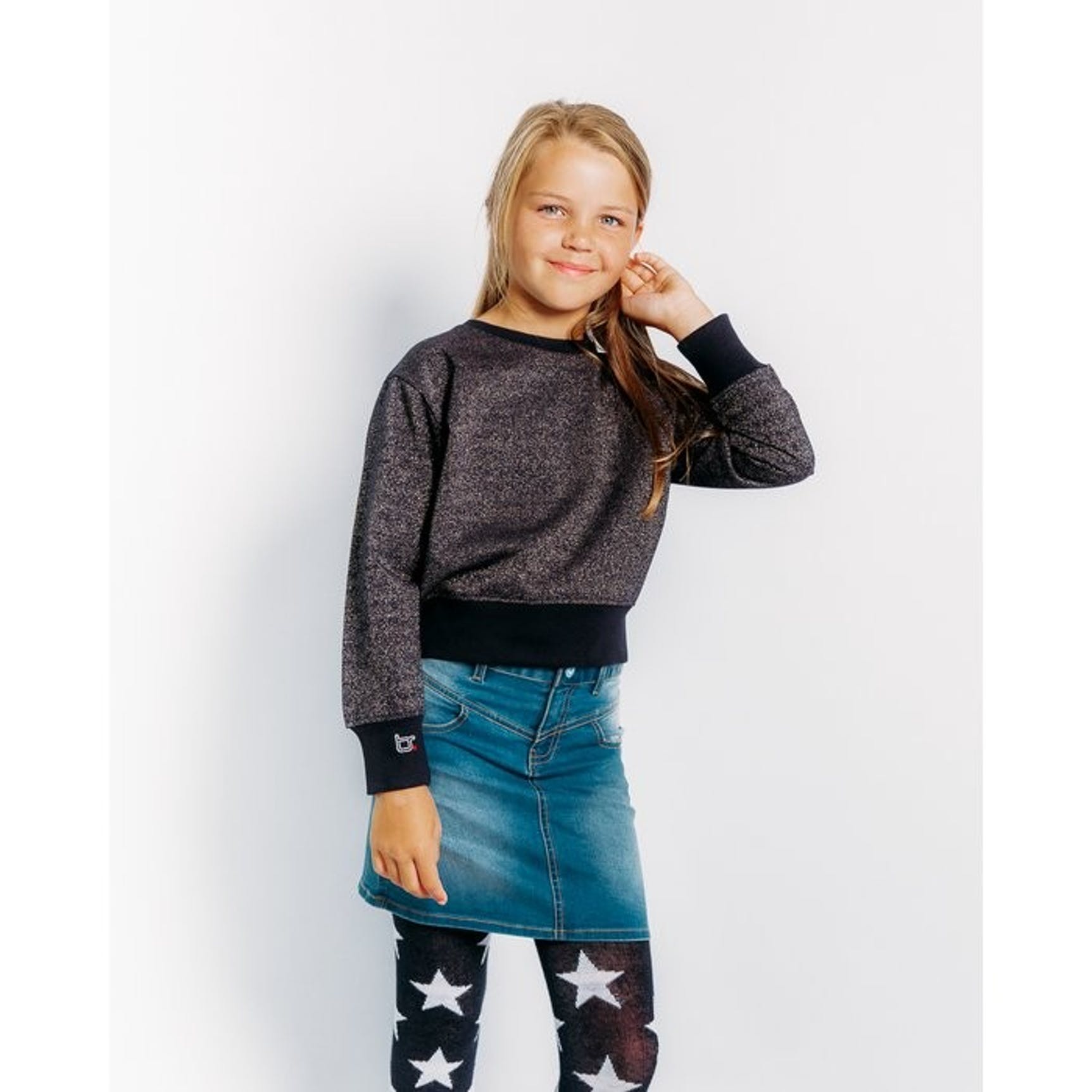 Stoere jeans rok met 2 steekzakken aan de voorzijde en Bobbi Ravioli button. Combineer deze rok met top Suus of Jane of met sweater Bibi of Evi voor een stoere look.