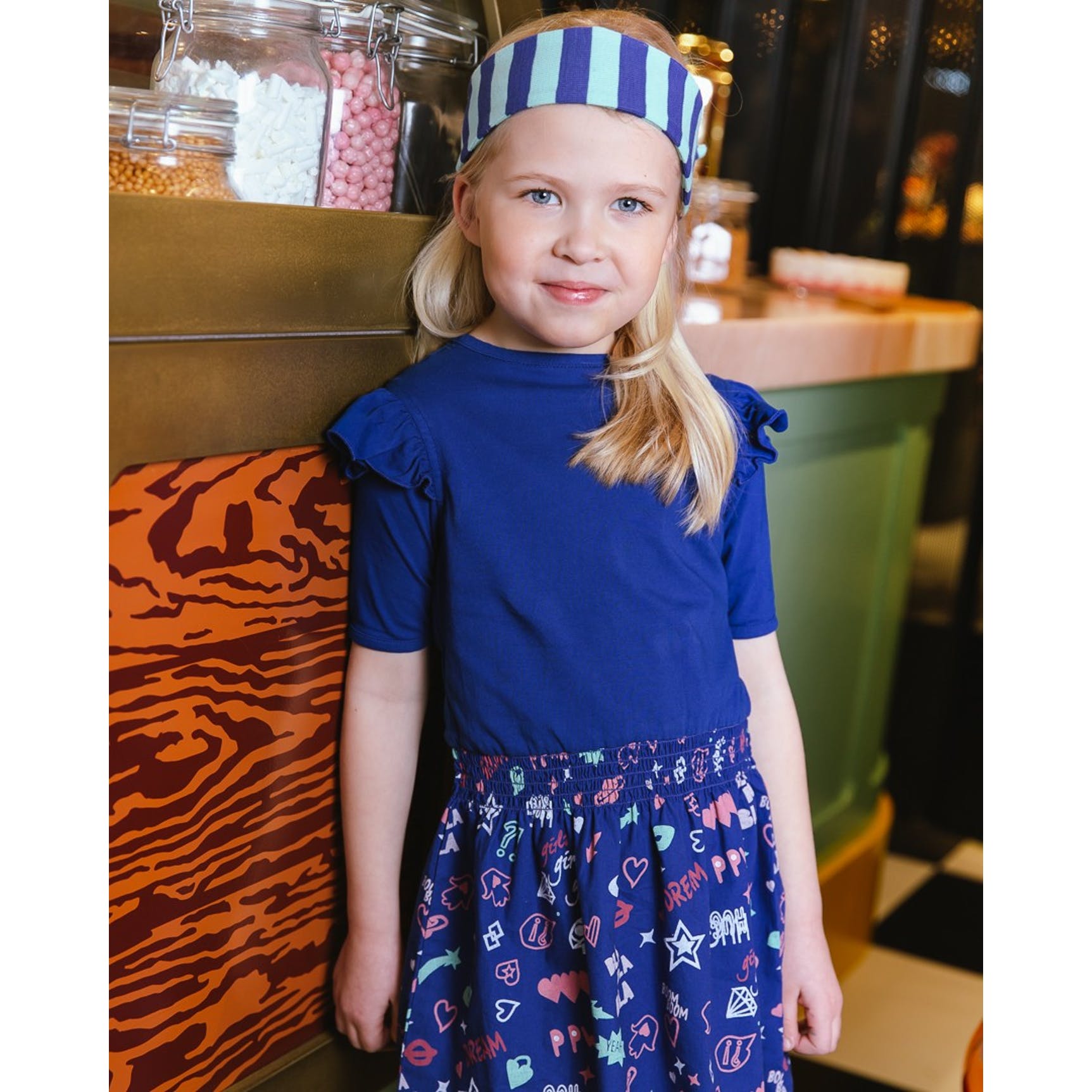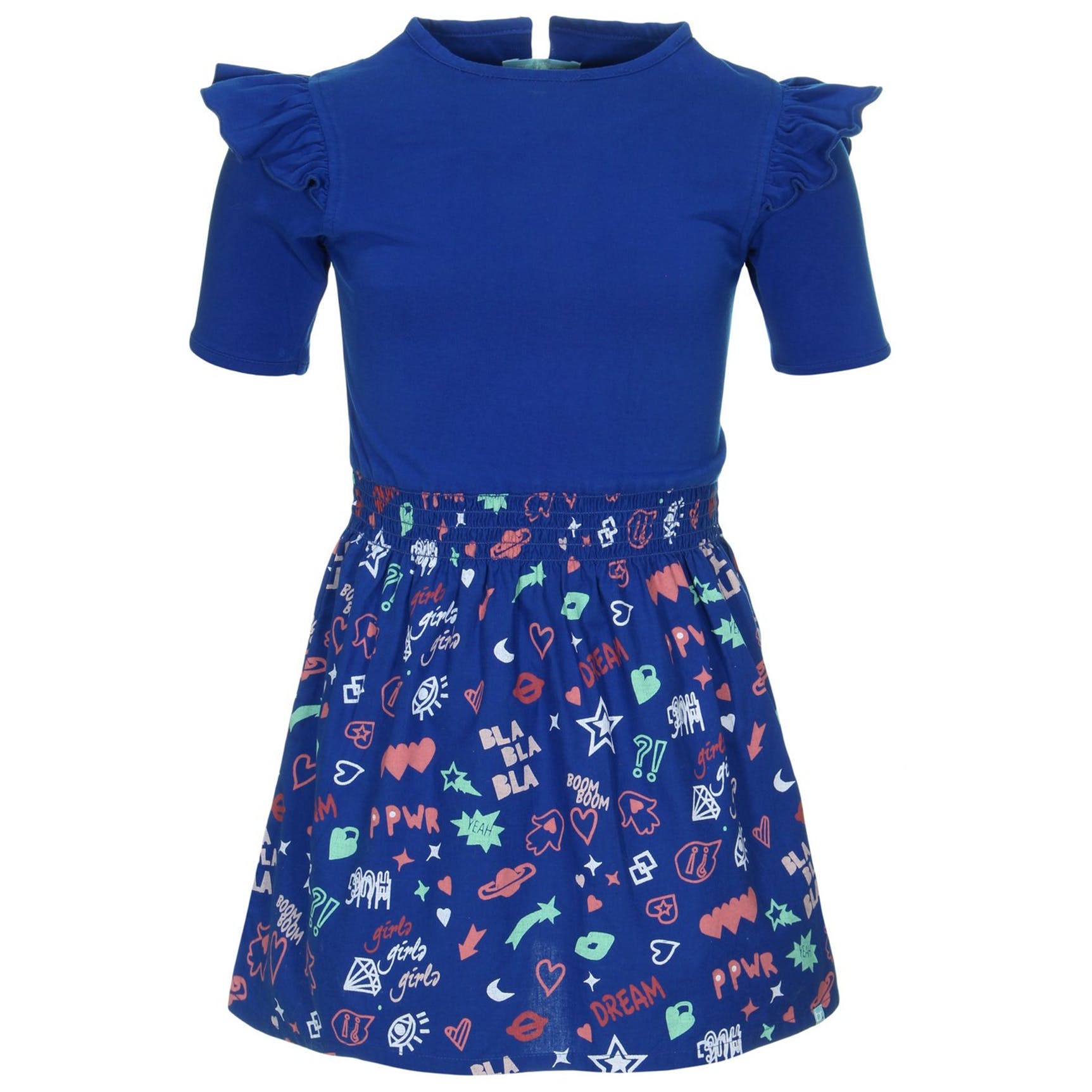 Jurk met ruches op de mouw en all-over fantasie print. De bovenkant van het jurkje is een jersey, de onderkant is geweven. Door de elastische tailleband sluit de jurk mooi aan.