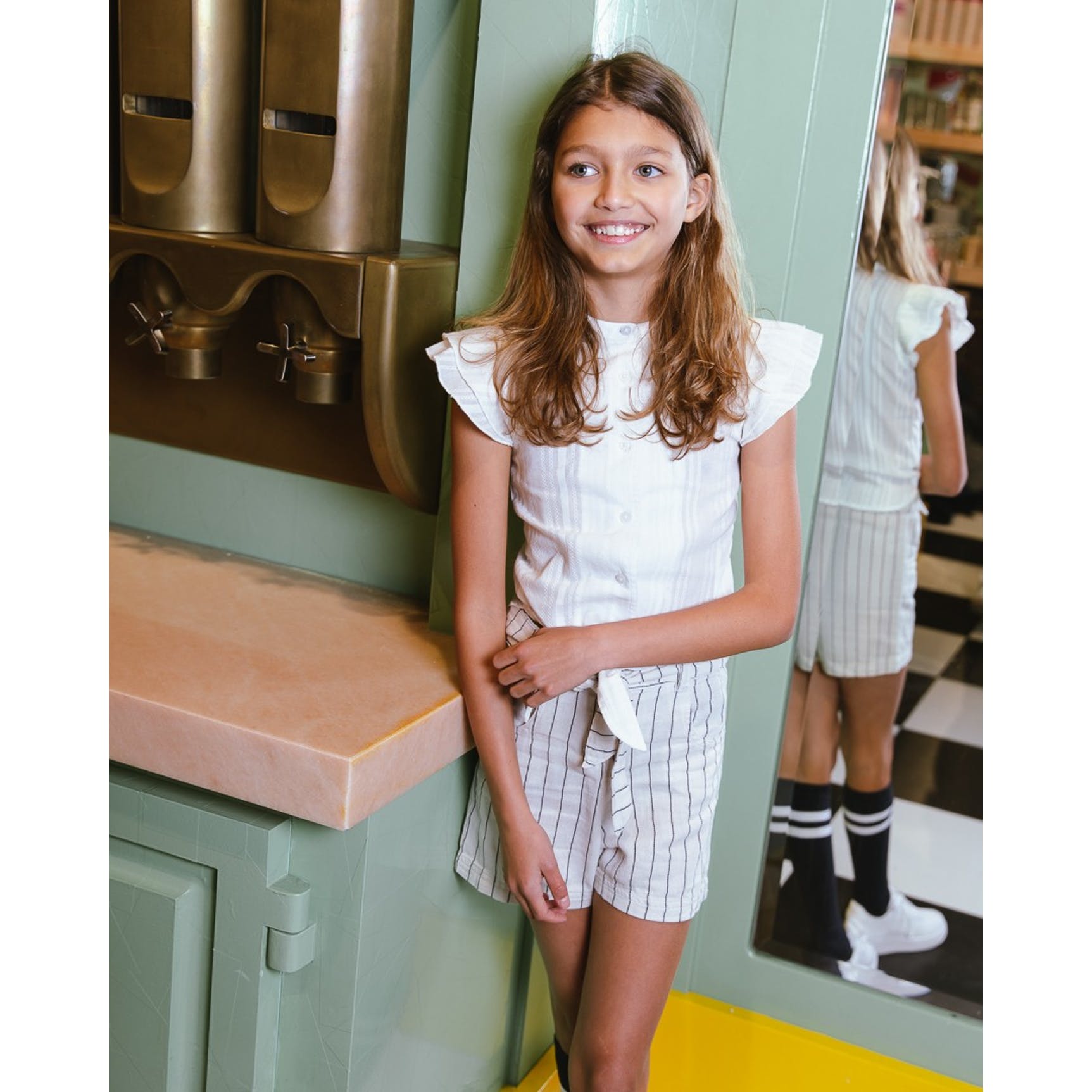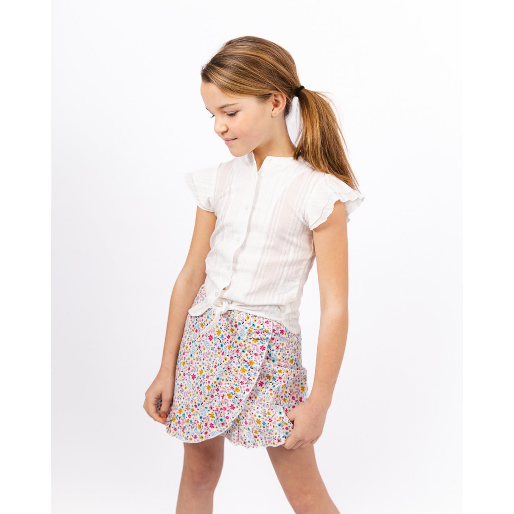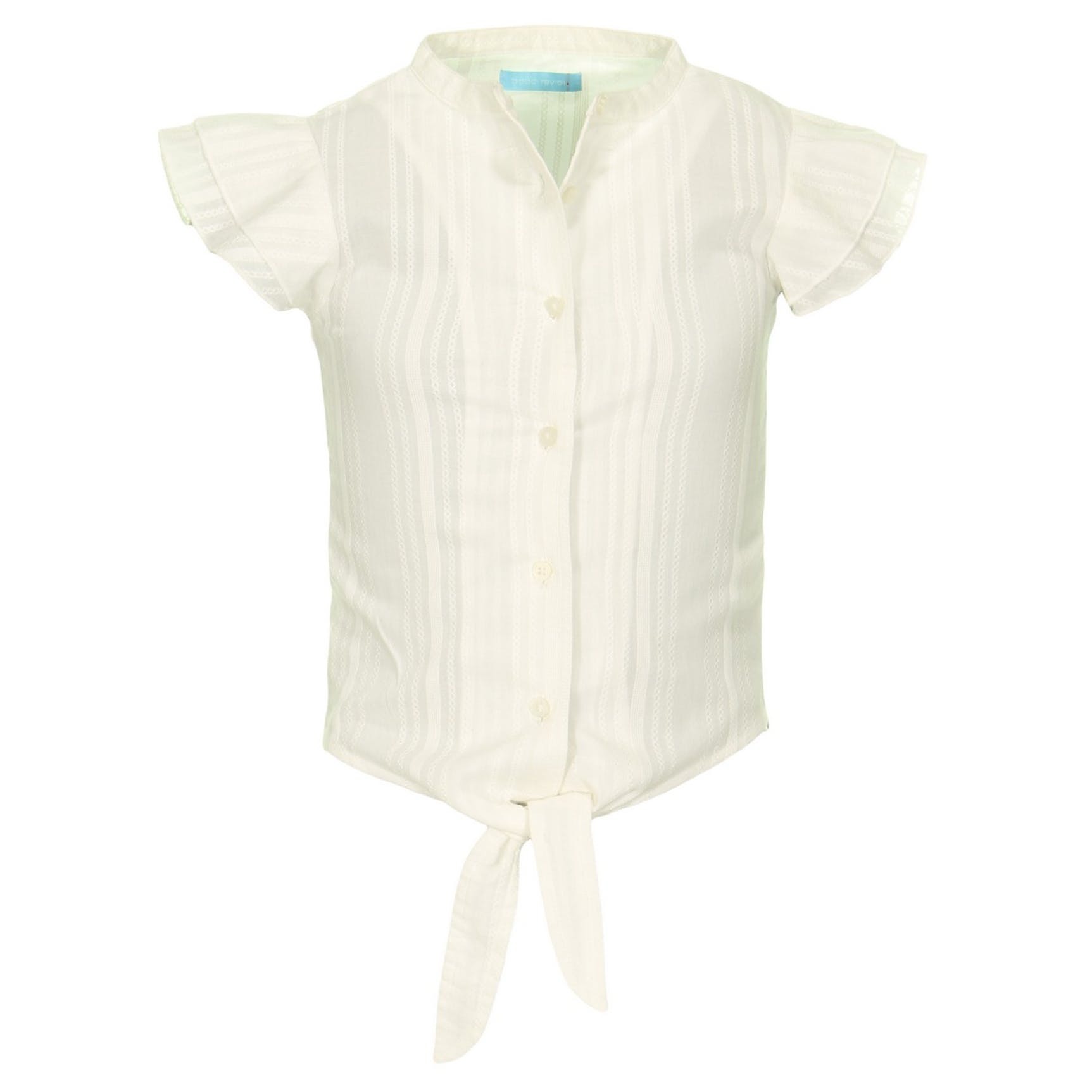 Prachtig geweven wit knoopblousje met knoopjes en ruches op de mouw. Deze blouse is gemaakt van 100% katoen.