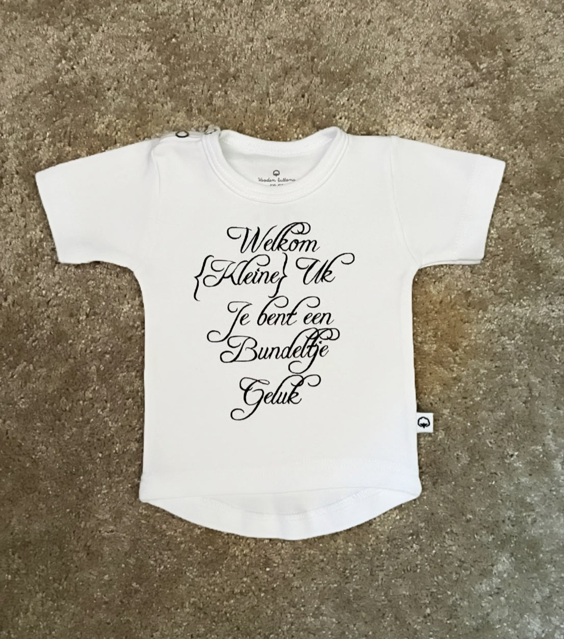 Custom made shirt in verschillende kleuren te bestellen met de tekst bundeltje geluk.