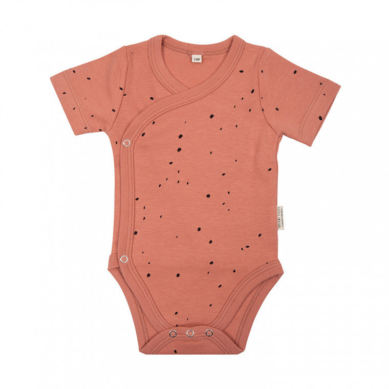Een pasgeboren wikkelromper met korte mouwen in canyon Clay met stippen print van kleine indianen gemaakt van biologisch katoen. Een echte must-have voor je pasgeboren baby. Gemaakt van biologisch katoen en geproduceerd onder duurzame omstandigheden in kalkoen. Past normaal. Perfect voor je pasgeboren baby.