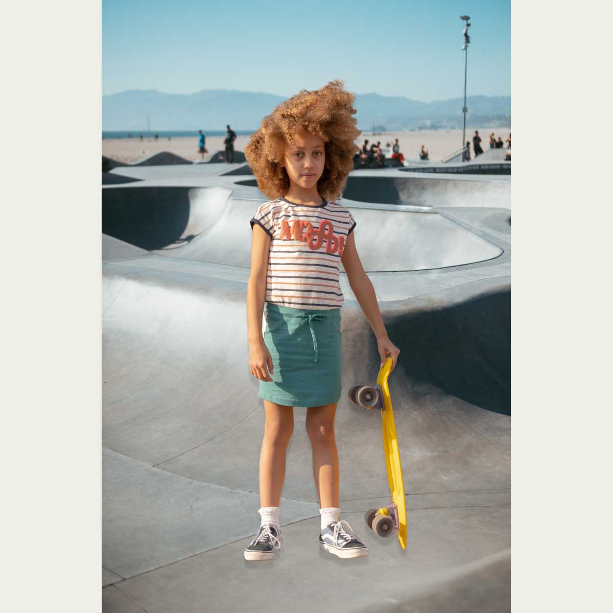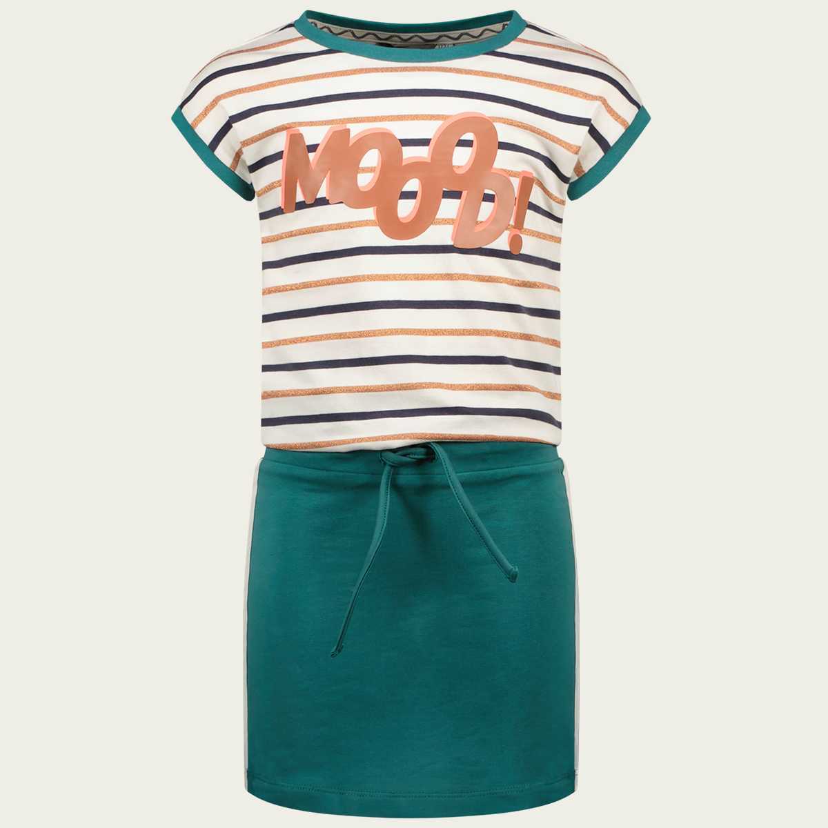 De Moodstreet sporty sweatdress in een nice groene kleur met girly gestikte banen op de zijnaden. Het bovenstuk is van een navy-witte- lurex koper gestreepte single jersey. Op het voorpand een mooie MOOOD print, for the nice effect. De katoen is Cotton Made in Africa.
