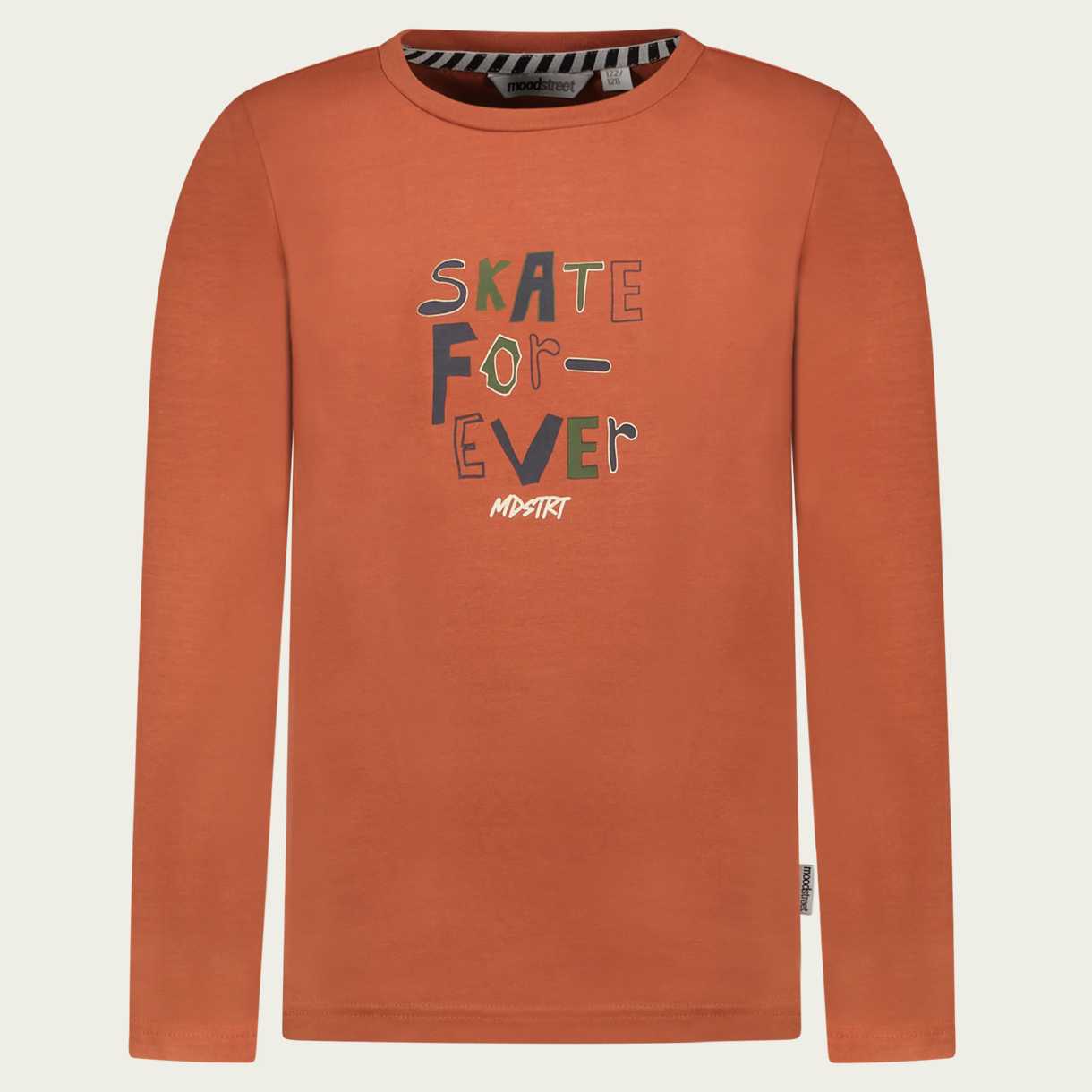 Skate For-Ever. Moodstreets basic longsleeve heeft een goede fit door de fijne elastan. Deze roest bruine heeft een stoere tekst print op de voorkant. Staat super onder het overhemd M208-6191_170. Als je voor dit item kiest, steun je het "Cotton made in Africa" initiatief.