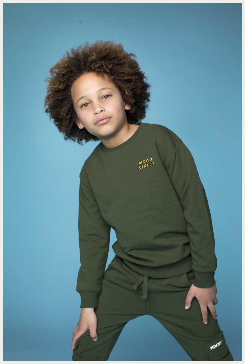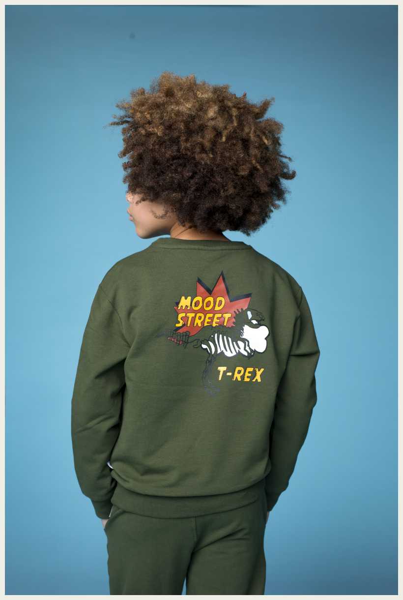 Deze Moodstreet donker groene crew neck sweater is gemaakt van een hele zachte sweatstof. Extra comfi door de 5% lycra. De dino borduur op de borst en dino print op de rug maakt 'm helemaal af. Super te combineren met de bijpassende Moodstreet sweatpants