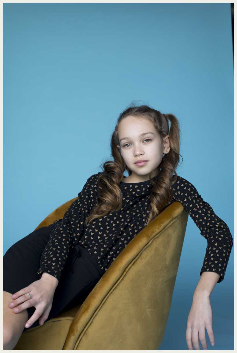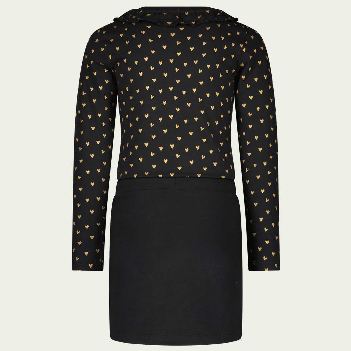 Altijd een hit, zo'n Moodstreet jurkje van verschillende stofjes. De top is van zacht gebreide T-shirt stof, in een zwarte kleur met een gouden glitter hartjes print. De ruffle langs de hals maakt 'm girly. Het rokje is van een comfi zwarte sweat stof.
