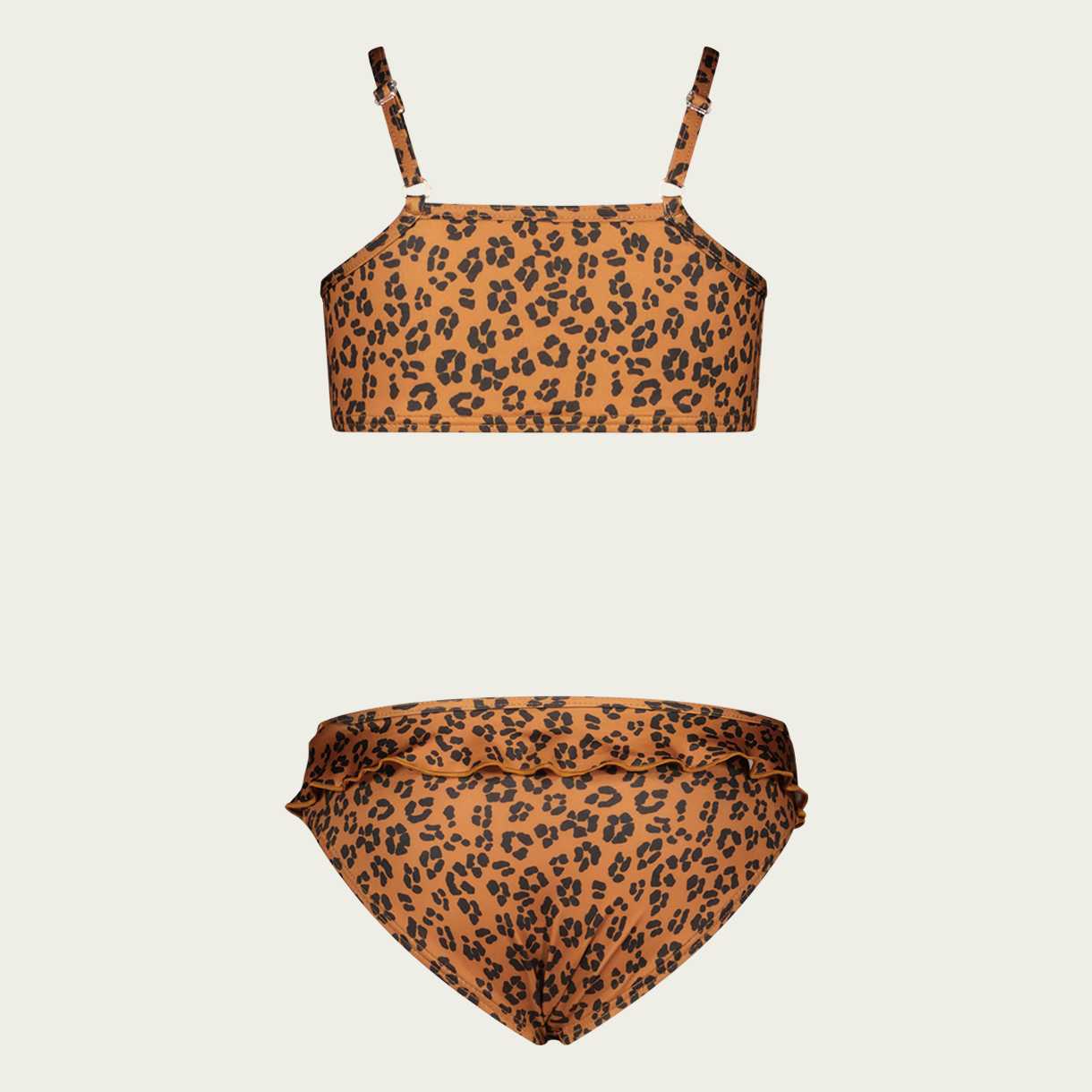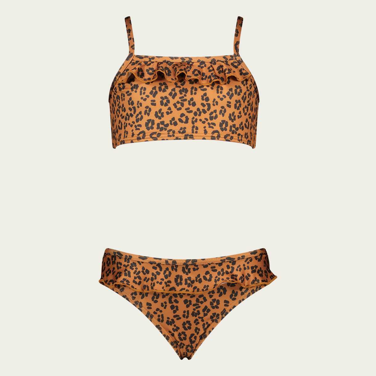 Zo nieuw en zo leuk deze Moodstreet bikini in een mooi bedrukte panter in toffee en zwart. Een ruffle langs de halslijn van het bovenstukje en langs de bovenkant van het broekje, dat is wat girls love toch? De fit is prachtig en de stof is ook nog voor een groot gedeelte van recycled materiaal en schijnt niet door! De bandjes zijn verstelbaar en makkelijk in fit aan te passen.