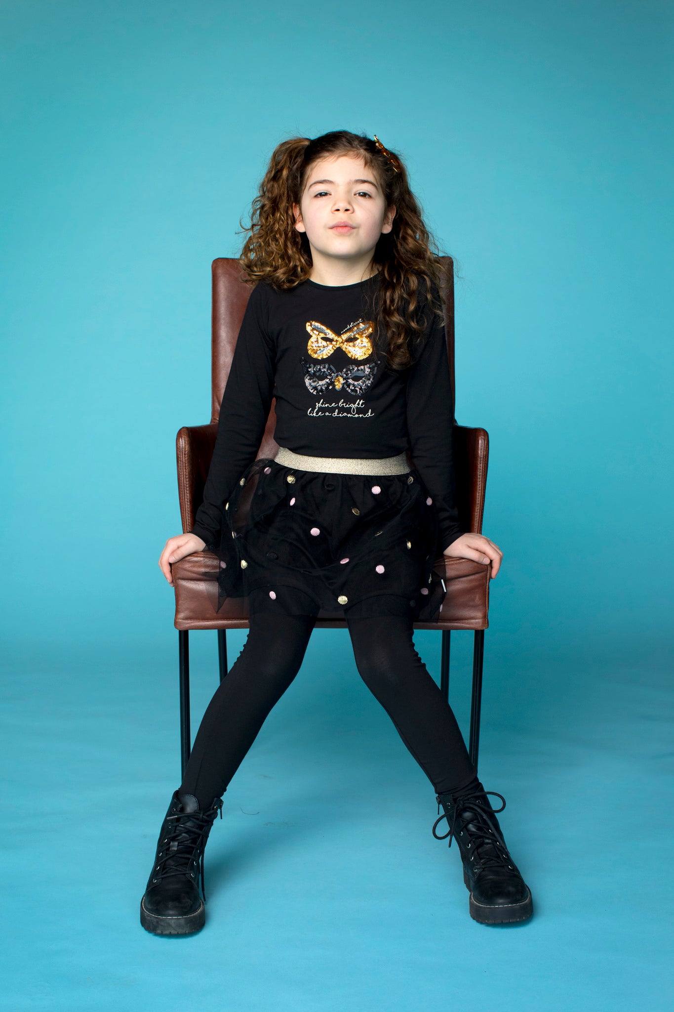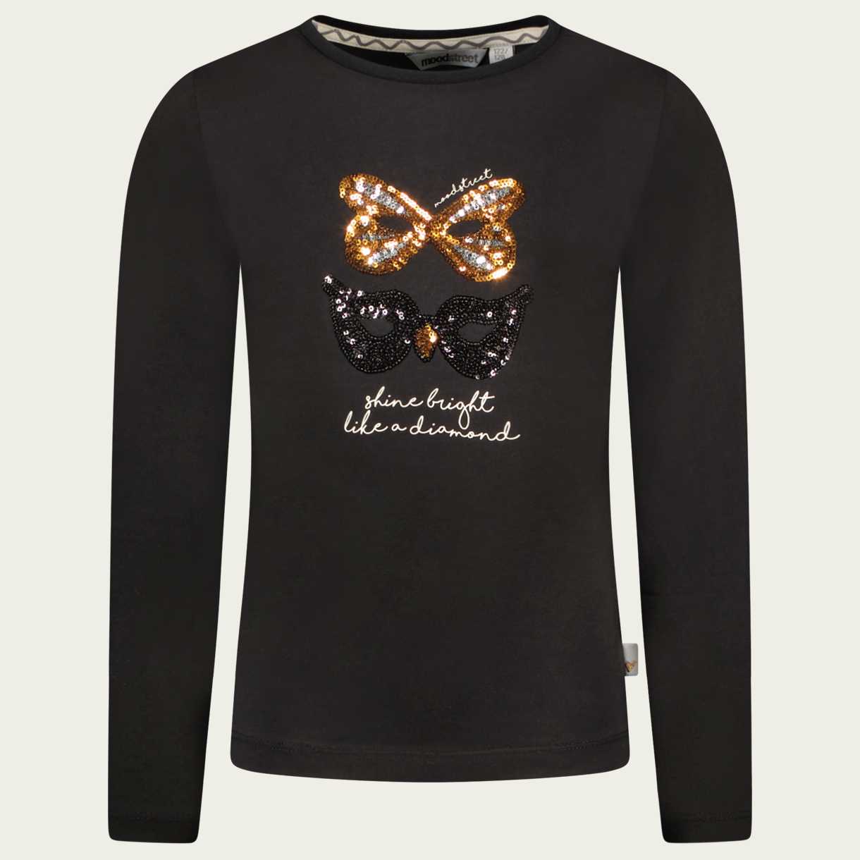 Glitter pailletten! De Moodstreet topper, deze longsleeve in stoer zwart met een beetje lycra voor de nice fit. De pailletten op de voorkant zijn gemaakt in de vorm van maskers, leuk voor een feestje! Heel leuk te combineren op de tule rok M209-5795_099.