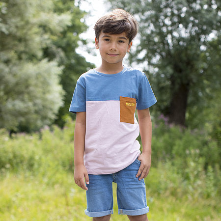 Colorblocking Moodstreet T-shirt in een stoere kleurcombi; cool lila, ice blue en een roest kleur als contrast borstzak met borduur. De jersey kwaliteit is heerlijk comfi door de lekkere stretch, als je voor dit item kiest, steun je het "Cotton made in Africa" initiatief.